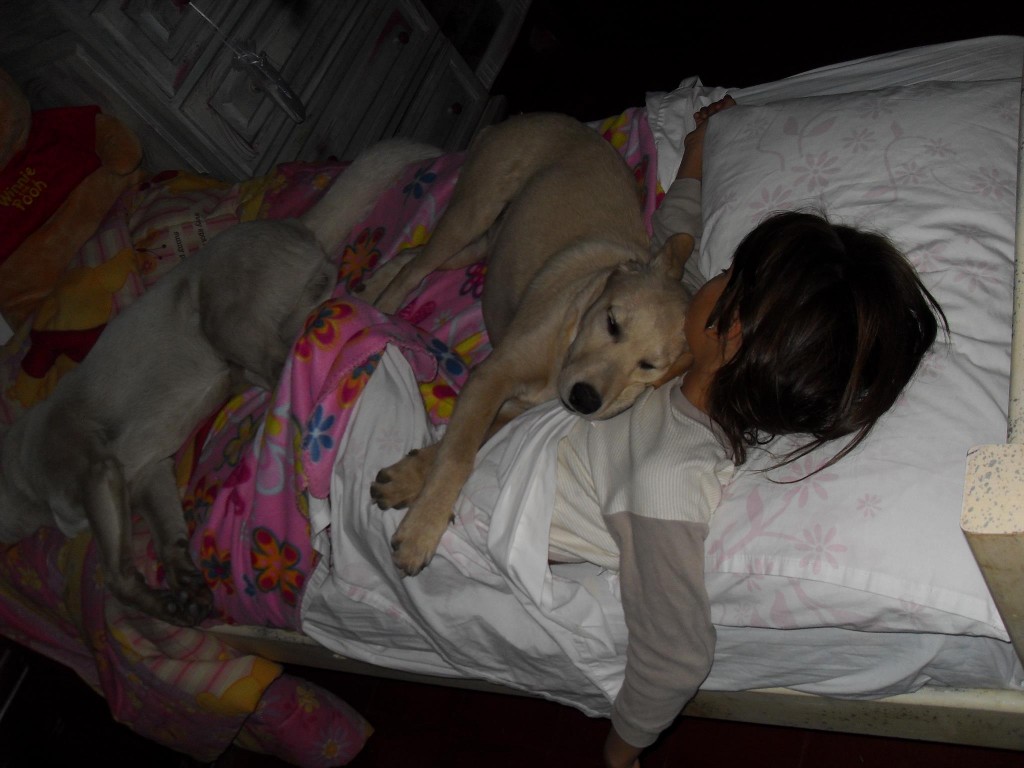 Eu tenho dois cachorros.Um Labrador fêmea chamada Anusha e um “labralata” macho chamado Arghos. Os dois dormen na minha cama junto comigo e o meu marido.As vezes acordamos meio doloridos, mas é muito gostoso tê-los em nossa cama durante à noite e mais gostoso ainda com eles nos dando”Bom dia”.
