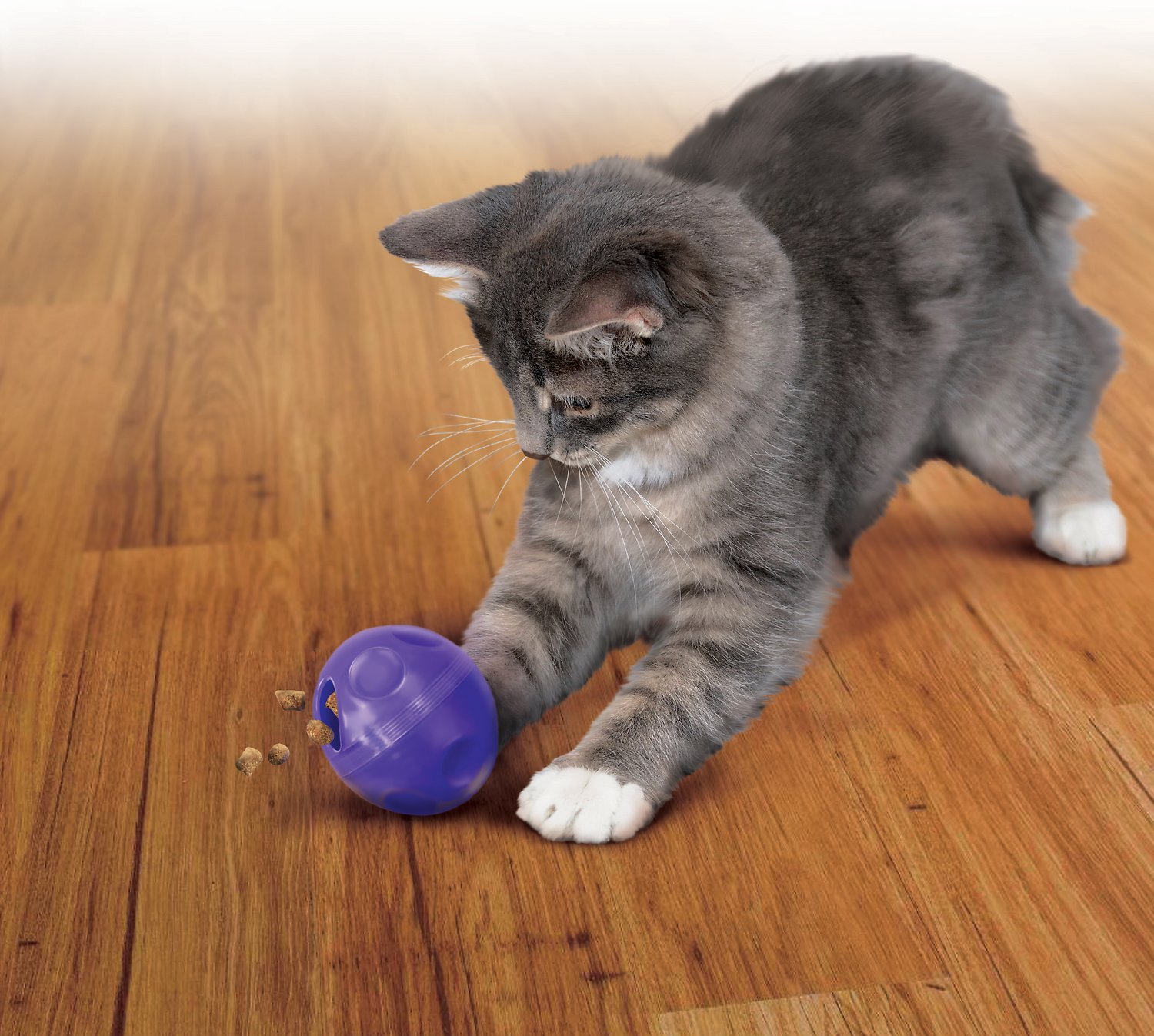 Existem vários tipos de brinquedos para estimular uma aimentação mais ativa para os gatos, estes são alguns exemplos.